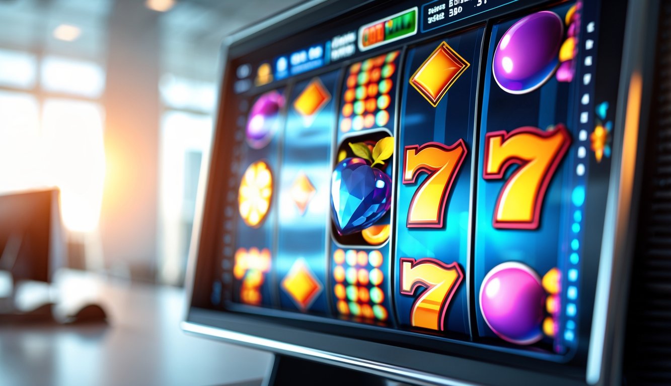 Tampilan layar komputer yang menampilkan permainan mesin slot dengan simbol warna-warni di lingkungan kantor yang bersih dan terang.